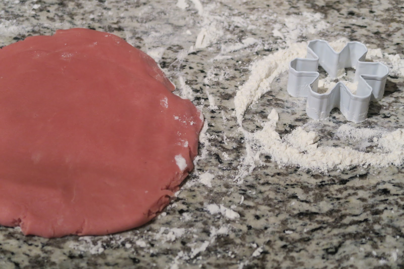 Roll dough on floured surface, leaving it thick (better cookies that way!) and cut whatever out you wish; I lost all my cookie cutters when we moved but I did find a snowflake at Kroger for $.63
